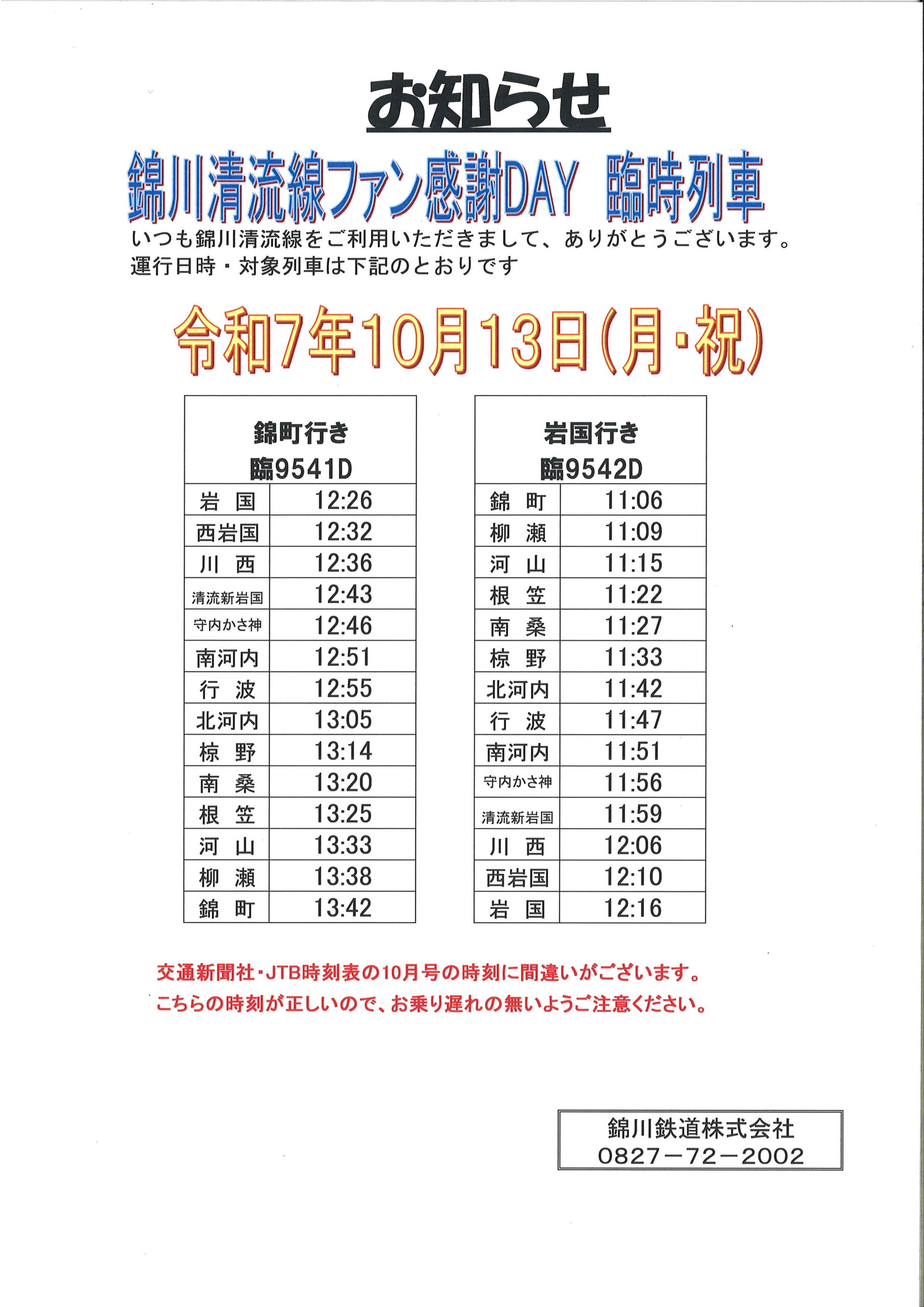 錦川鉄道では、令和7年10月13日(月・祝)に「錦川清流線ファン感謝DAY」を開催いたします。