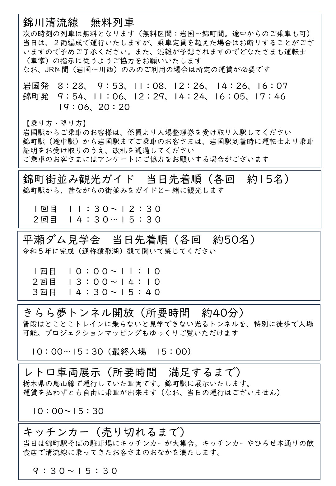 当日は、錦川清流線に「無料」で乗ることができます。(岩国~川西間のみのご利用の場合は所定のきっぷが必要です)